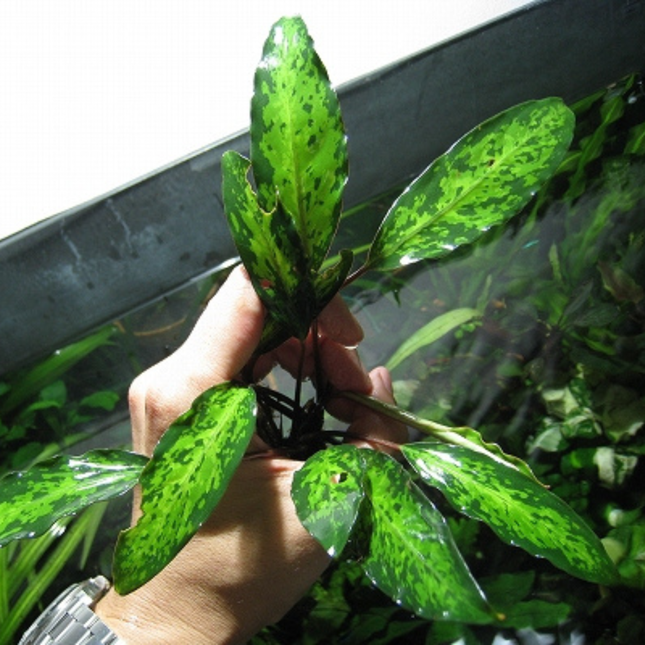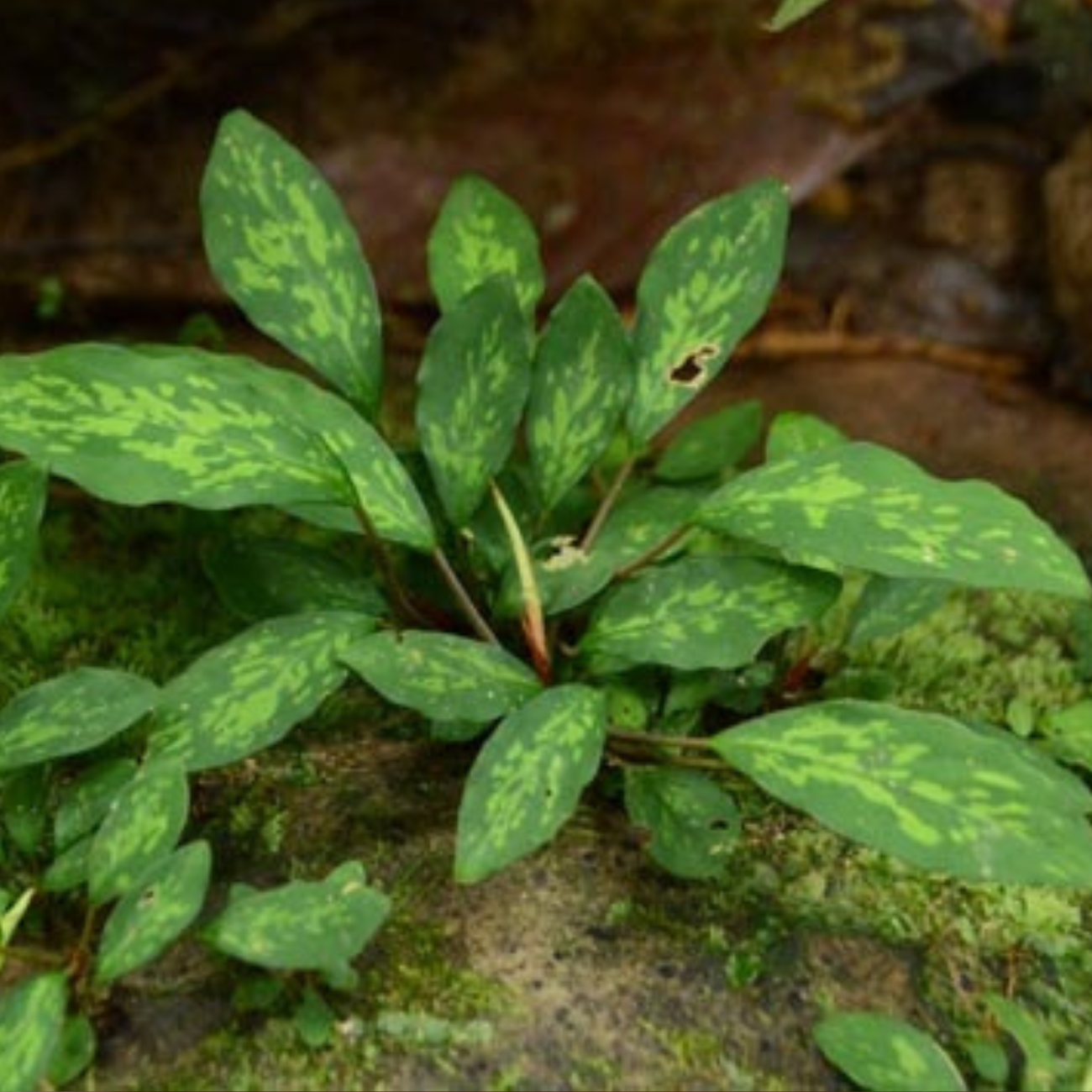 Descubre esta joya de la acuariofilia, una planta acuática rara ideal para, pez disco, peces bettas, bajos requerimientos, aquascaping y gambarios. Originaria del Sudeste Asiático, su patrón de hojas verde oscuro con manchas claras, y sus pecíolos púrpuras, crea un impresionante efecto de camuflaje.